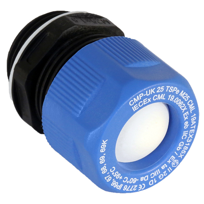 The TSPe Ex polymer strain relief range of cable glands are suitable for use in explosive atmospheres with unarmoured or braided cable when terminated inside the enclosure, and have a temperature rating of +95°c to -60°c.