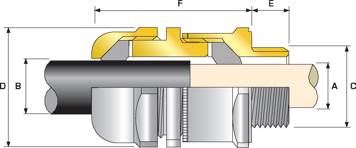| Cable Gland Size | Available Entry Threads 'C' (Alternate Metric Thread Lengths Available) | Overall Cable Diameter 'A/B' | Across Flats 'D' | Across Corners 'D' | Protrusion Length 'F' | Combined Ordering Reference (*Brass Metric) | Shroud | Cable Gland Weight (Ozs) |