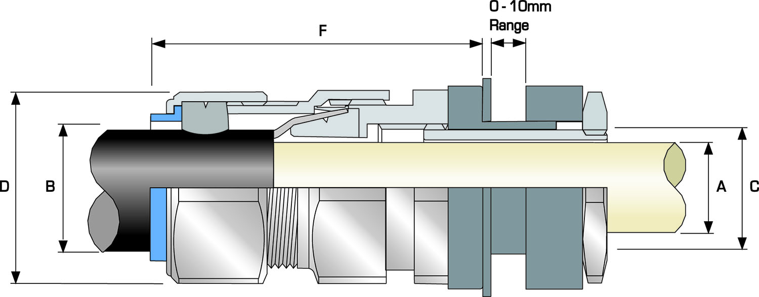 Cable Gland SizeClearance Hole Diameter "C"Cable Bedding Diameter "A"Overall Cable Diameter "B"Armour RangeAcross Flats "D"Across Corners "D"Protrusion Length "F"Ordering Reference (Brass Metric)Shroud (B348)Cable Gland Weight (Kgs)