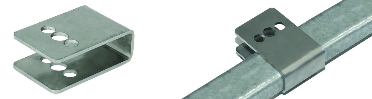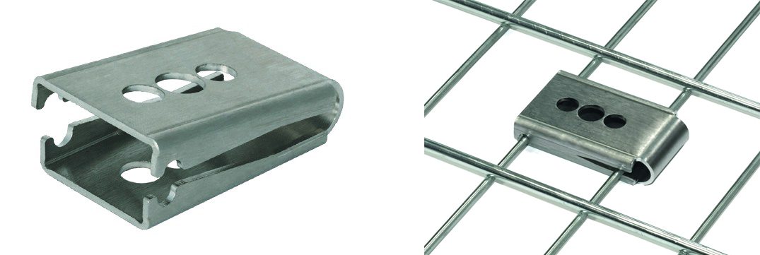 The CMP Wire Mesh Cable Tray / Basket Clips are manufactured from 316L Stainless Steel and are designed to allow cable cleats to be safely installed onto wire mesh cable tray and / or basket. The CMP basket clip has one M12 and two M10 clearance holes, and slides over the mesh wires of the tray or basket to provide a secure fixing surface for the cable cleat to be attached to. The CMP wire mesh cable tray / basket clips have been utilised and tested during short circuit conditions as specified in IEC 61914 ‘cable cleats for electrical installations’.