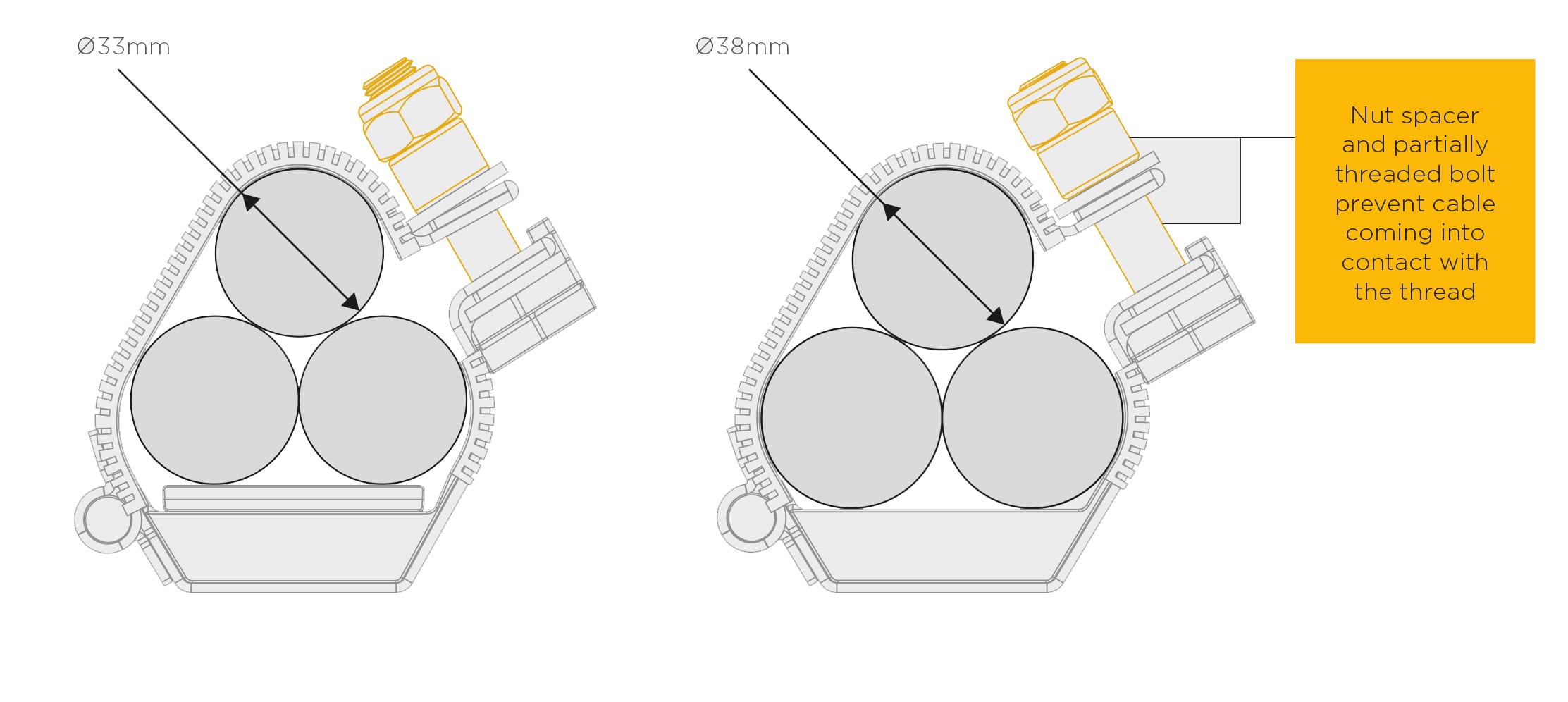 Industry-wide, a fully threaded bolt is used as standard to ensure that the cable cleat can accept a range of cable diameters. However, the use of a fully threaded bolt can lead to damage to the cables during high short circuit fault conditions.