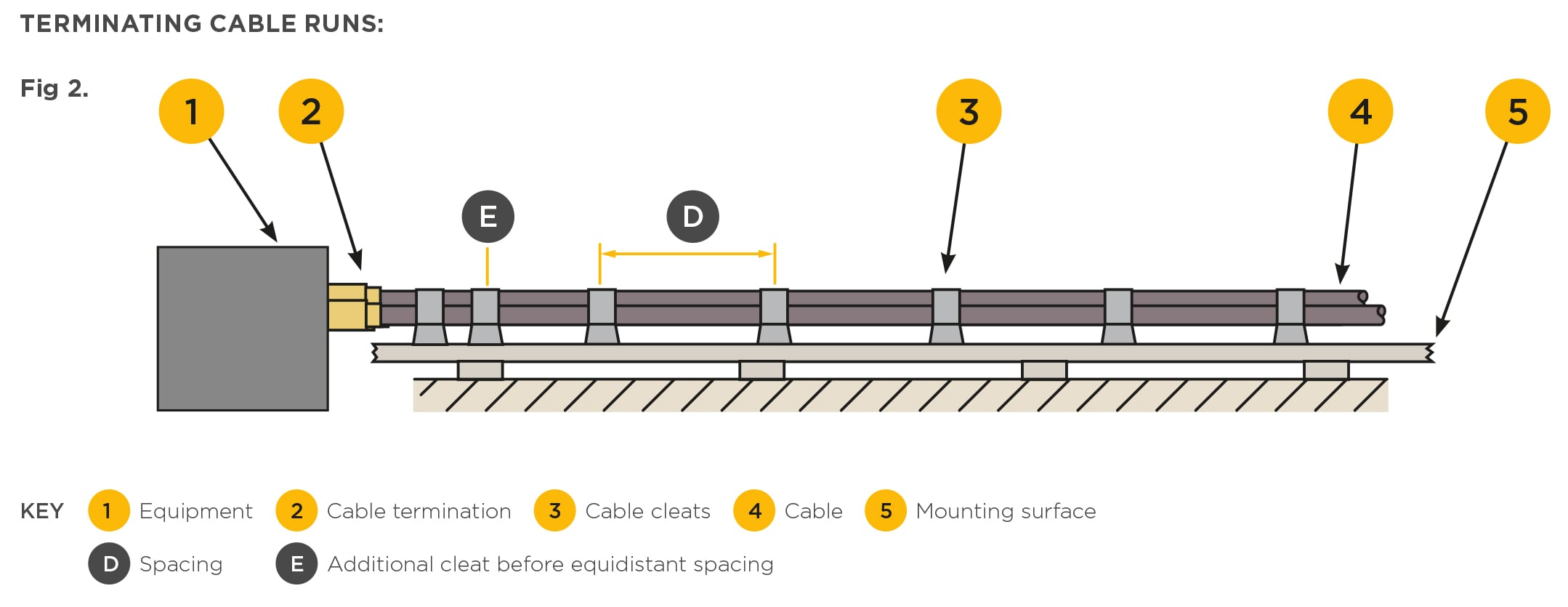 As a guide to good practice, CMP recommends that throughout these changes in direction, cable cleats should be installed at a distance of 300mm; if this is not possible due to the lack of substructure then it is recommended that as an alternative to cable cleats, intermediate restraints are used in conjunction with cable cleats, spaced equidistant between the fixed cable cleats.