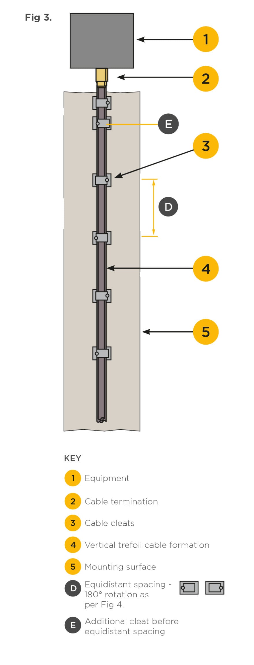 CMP Products recommends that cables that are to be installed in trefoil formation, in long vertical runs should use a method known as ‘alternative cleating’. This method involves installing cable cleats at equidistant spacing, but rotated by 180° every cleat.