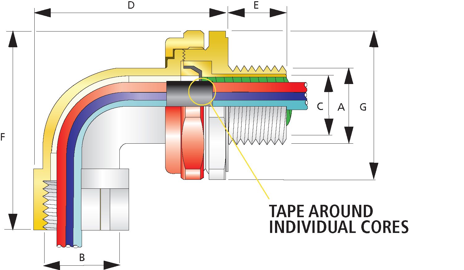 | Ordering Reference (Brass, Metric) | Male Forward Thread Size 'A' | Minimum Thread Length 'E' | Female Rear Thread Size 'B' | Ordering Reference (Brass, NPT) | Male Forward NPT Thread Size 'A' | Minimum NPT Thread Length 'E' (in) | Female Rear Thread Size 'B' | Diameter over Cores "C" | Max. number of Cores | Max Protrusion Length 'D' | Max Overhang Length 'F' | Across Flats Hex 'G' | Across Corners Ø 'G' | Installation Torque (Nm) |